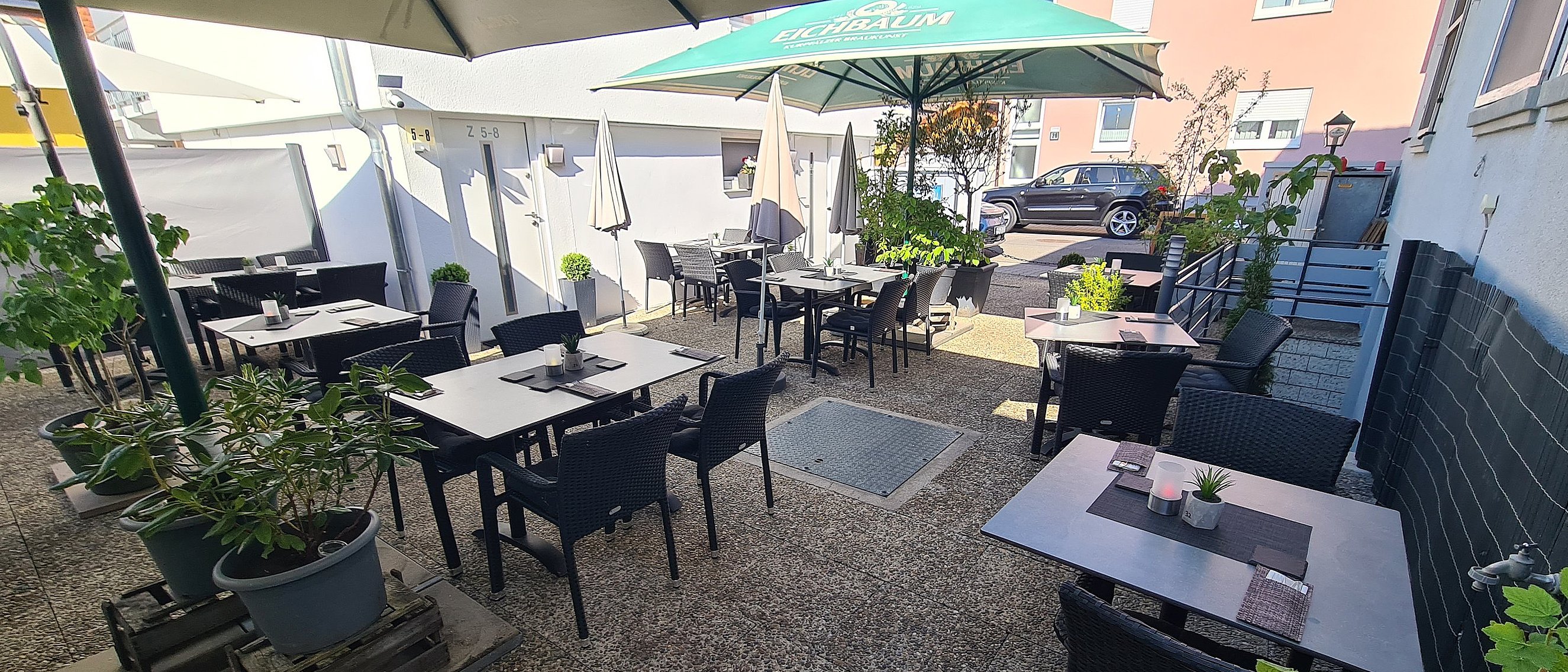 Unser Biergarten ist eine Oase im Städtchen Lorsch. Bei sommerlich hohen Temperaturen findet man unter großen, schattenspendenden Schirmen in der Abendstunde eine kühle Erfrischung und die bekanntermaßen schmackhaften, vom Küchenchef frisch geklopften und panierten Schnitzel, die leckeren Rumpsteaks und die mit Liebe und Idee zubereiteten Gerichte und Menüs aus der Wochenkarte.
